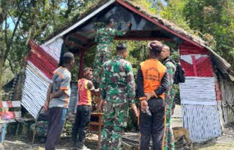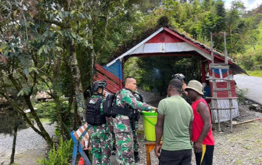 TargetInvestigasi.co.id, Puncak Jaya Papua – Pagi hari yang sejuk di pegunungan Distrik Irimuli tepatnya di Kampung Wandenggobak, nampak beberapa masyarakat gotong royong bersama anggota Satgas 712/Wiratama dari Pos Kalisemen memperbaiki dan mempercantik Gapura Kampung, Jumat (24/11/2023).
