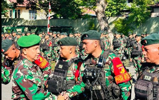 TargetImvestigasi.co.id, Kota Bitung – Pangdam XIII/Merdeka Mayjen TNI Legowo W.R. Jatmiko, S.I.P., M.M., menyambut kedatangan Satgas Yonif 712/Wiratama Purna Tugas Ops Pamtas RI-PNG Kewilayahan TA 2023, bertempat di Lapangan Secata Rindam XIII/Merdeka, Bitung, Sulawesi Utara, Jumat (29/12/2023).